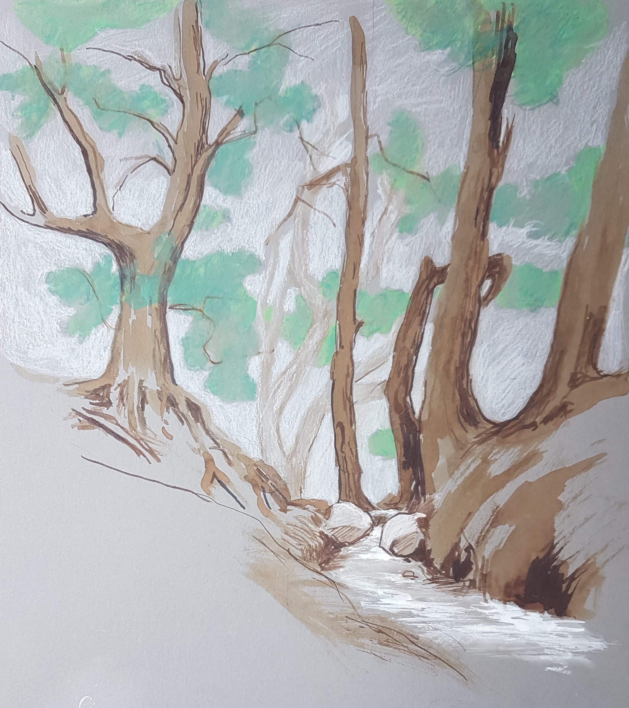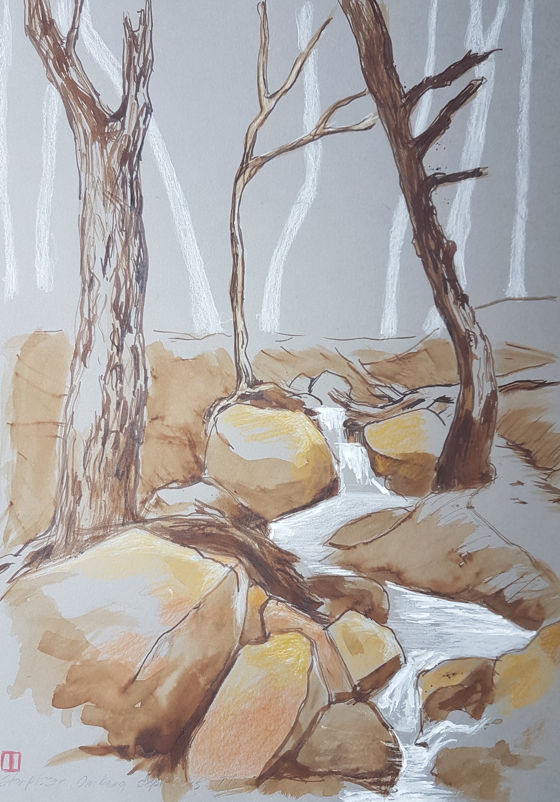 I september opholdt jeg mig en uge i naturområdet Omberg ved Vadstena sammen med kunstnerruppen DANE. Billederne er med tusch og farvekridt på gråt karton.