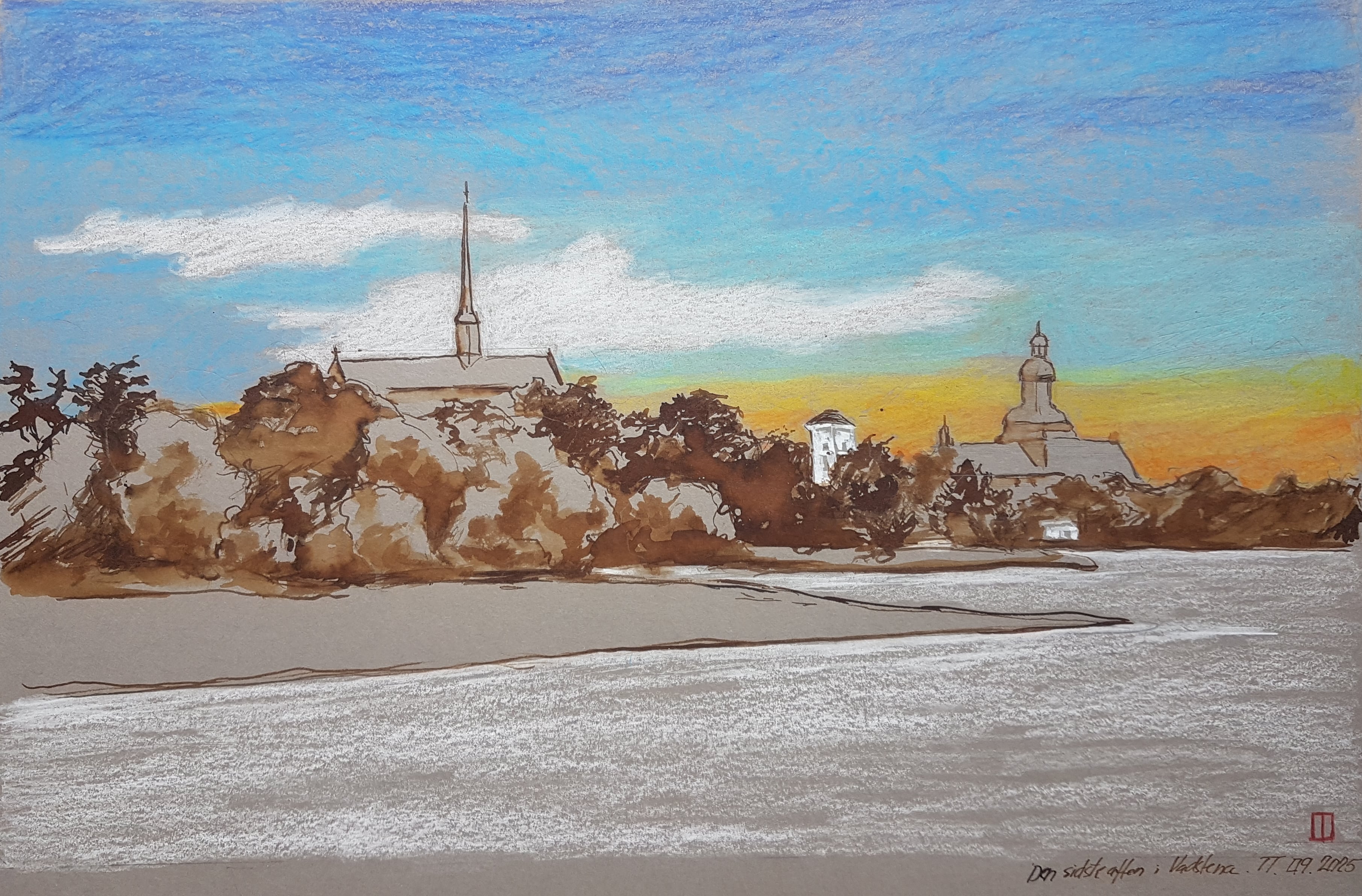 Jeg tilbragte nytåret 2024-25 i Dalarne, Sverige. Der var ikke ret mange lyse timer, men utroligt mange smukke himle. Tusch og farvekridt på syrefrit karton. 20 x 28cm. 900 kr.u/ramme